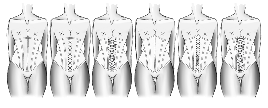 You can decide to get your underbust rounded or pointy. Each corset have a lacing up on the center back but you can choose whether having a plain front, a straight lacing up or a tilted one. If you order the tilted version you can add a matching stomacher. That way you can decide whether showing off your skin or covering it up for a more historical result